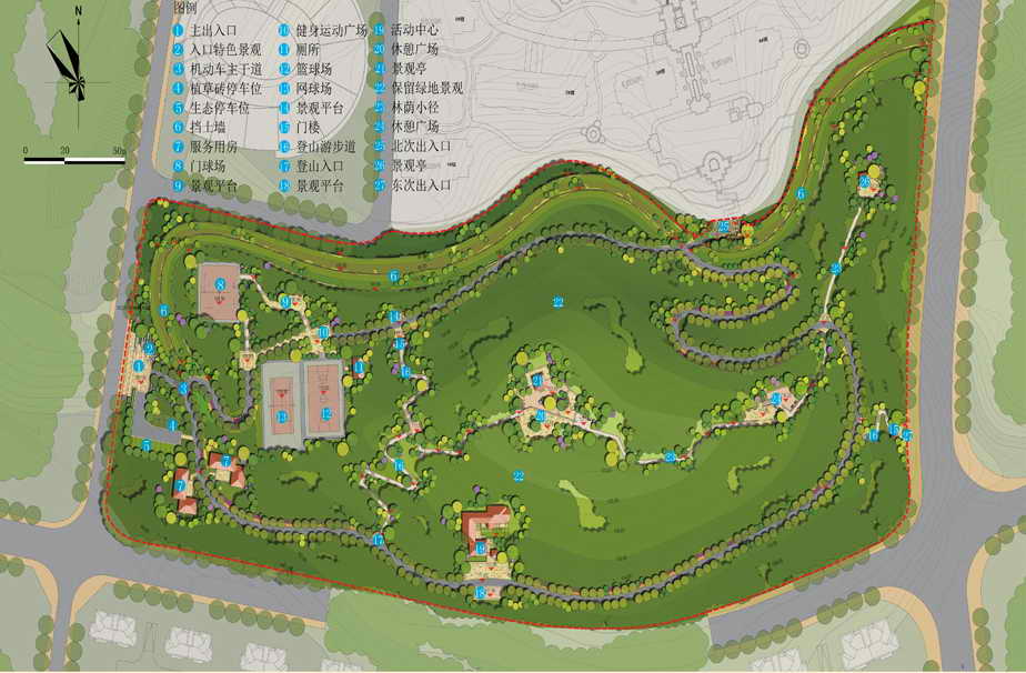 项目介绍:“生态自然”的主题贯穿整个体育公园的设计。 体育公园利用山体、植被等优越条件,以自然山体为依托,构筑以体育运动、休闲、健身为一体的生态体育公园。通过整个山体的自然形态,把设计融入其中,形成一个立体三维的休闲健身场所,同时满足了人们对大自然亲近的渴望。