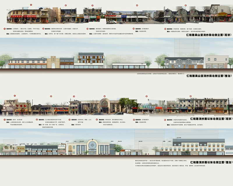 项目介绍:仁和路,东起岳王路南端,西至湖滨路,因路在旧钱塘、仁和两县交界处的仁和县一侧,故名仁和路。邮电路,位于解放路北,延安路东,因在此简历邮电局而得名。两条路都处于城市中心区块,我们试图营造适合的街道氛围,使街道自身悠久的历史底蕴与城市的现代气息相融合。 仁和路,北边主要排布着民居和幼儿园,底层布置着些许商业店面,南边是正在建设中的浙江省中医院。道路面较宽,人车流都较少,街道比较清静,环境秩序良好。建筑尺度较小,且建筑风格统一,均为青砖饰面的古建外贸。幼儿园与消防中心风格比较不协调。因此,街道整治的目的在于强化街面的特色,突显历史韵味,同时,在保证街面原有的秩序的同时,使街道更优生机和活力。建筑整治以幼儿园和消防中心两幢为重点,强化街道整体氛围,并保留每幢不同功能建筑一定的自我特色。 邮电路,两侧皆分别布置着医院,饭店等公共建筑,建筑风格不统一,电线牵拉无序,街景较杂乱。人流车流密集,临时停车秩序混乱。因此,政治的原则是规范路面临时停车位,清洗并统一沿街建筑的外立面,使道路更清爽宽敞。建筑整治也以清洗为主。