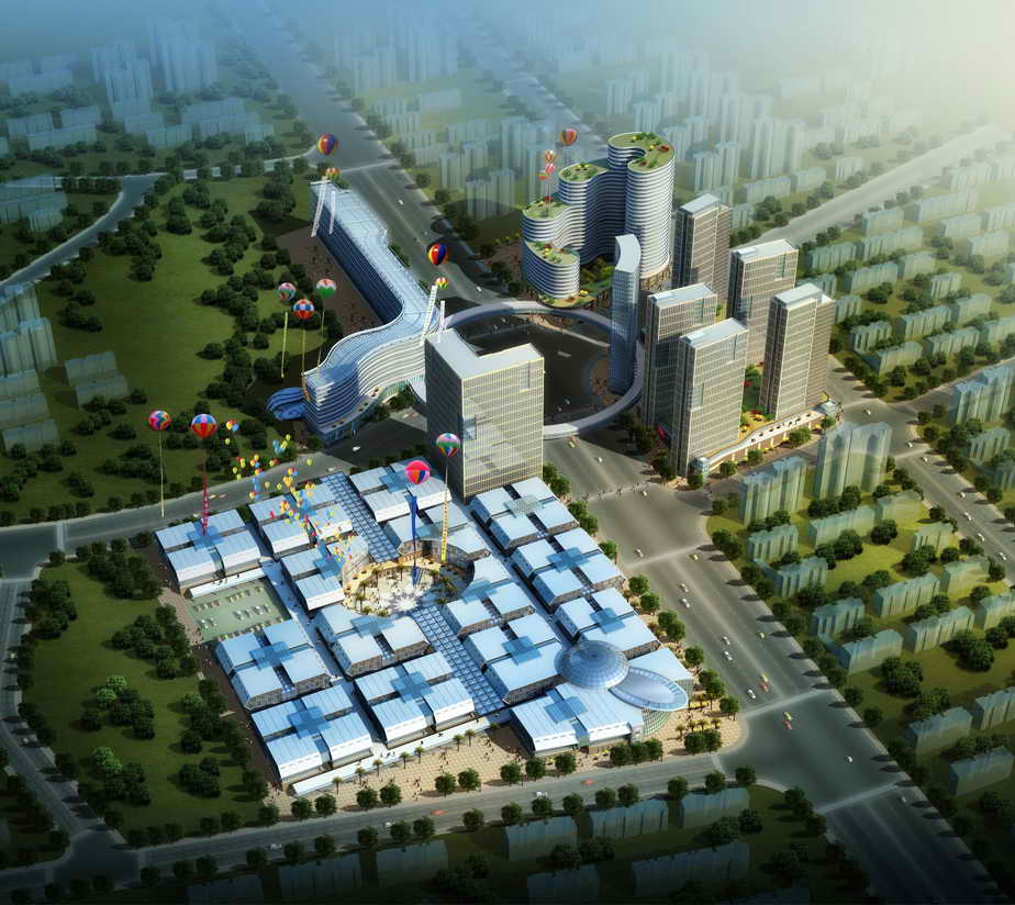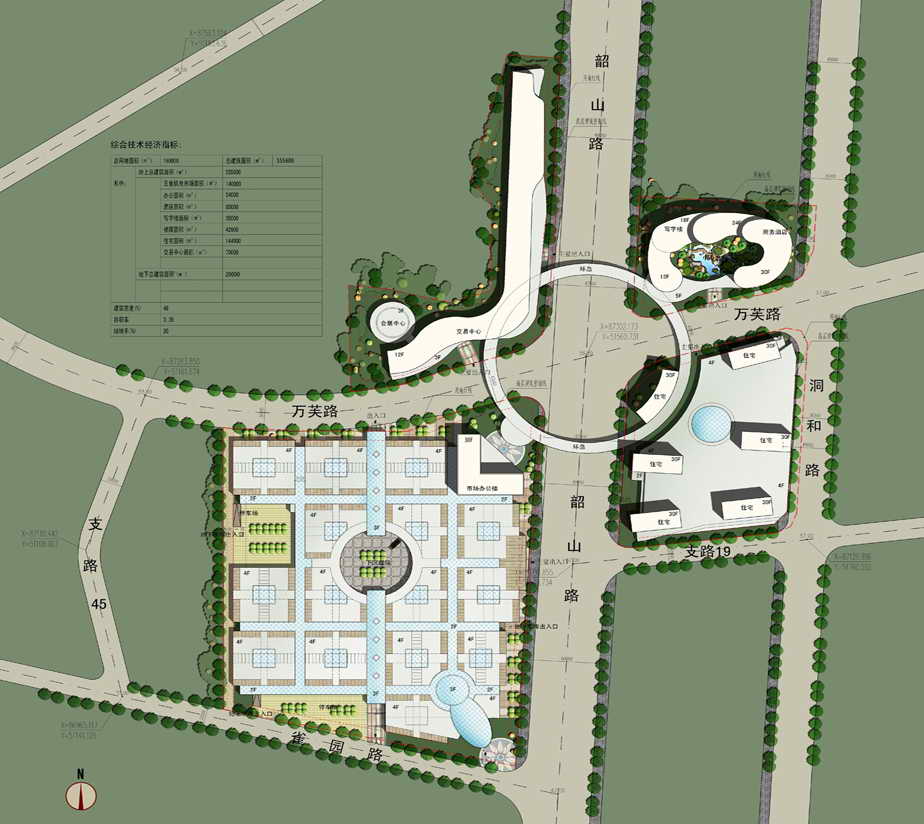 项目介绍:本案总占地240亩,位于雨花区洞井镇鄱阳村。新韶山南路与万芙路穿过小区,将项目用地分成了四个区域。由于位于城市主干道,发达的路网使得本项目区域交通优势凸显。设计上以行业特性为基础,依托未来专业市场发展的趋势,做到区域内土地价格最大化。建立一个专业的升级版的五金机电市场为主体的,高端商业服务配套的现代经济商圈,集五金机电市场、多功能信息中心、高档写字楼、高档酒店、成熟生活配套设施于一体的特色综合商业生活区块,成为服务周边,辐射全区的功能区域。整合规划中的城市绿地与道路系统;合理分配建筑与周边的关系,与城市规划体系合理衔接,形成一个交通规划最优化的区域;建筑的功能组成、造型风格与现代生活方式、文化氛围相呼应,创造新颖而充满活力的商业综合体。